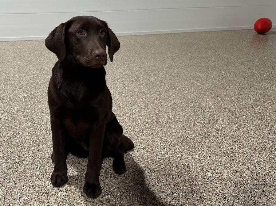 Babybel - a 12-month-old black gal from English lines. She can be peppy and mischievous, but she has a heart of gold. You can often find her getting into innocent mischief - the comic relief of the kennel.