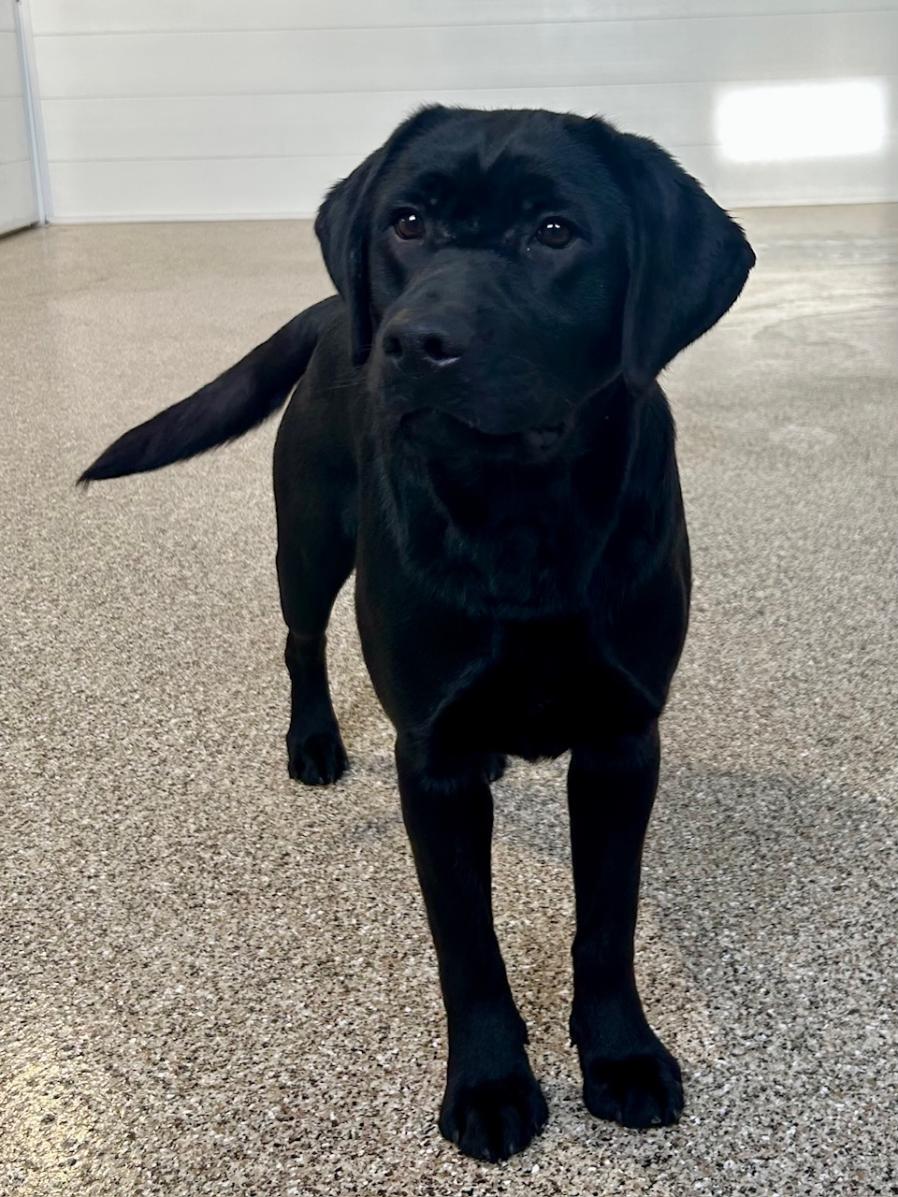 Pebbles - a 9-month-old black gal - very closely related and similar to Alba, she is an equally sweet and affectionate pooch who would make a great hunting dog and companion.